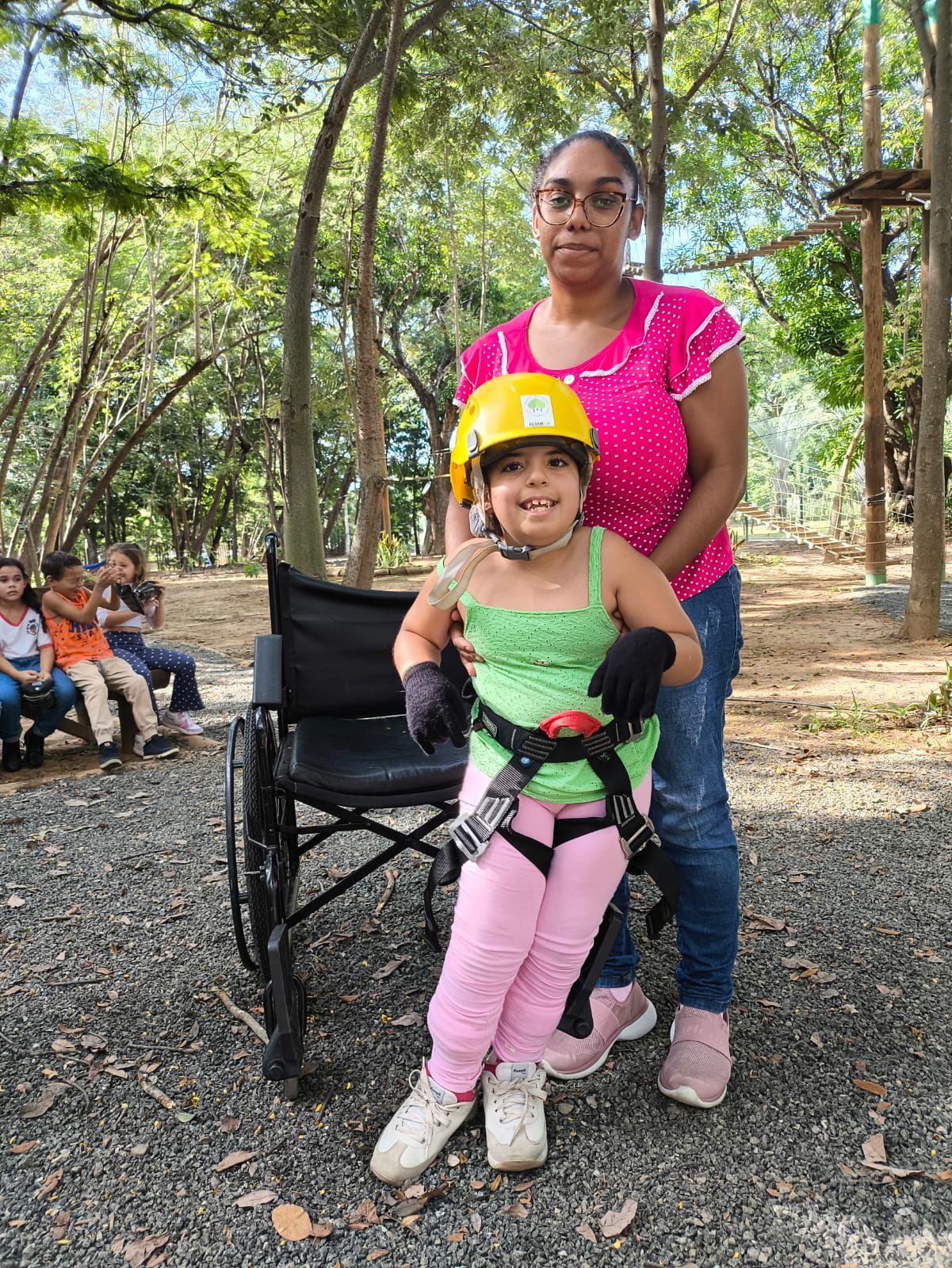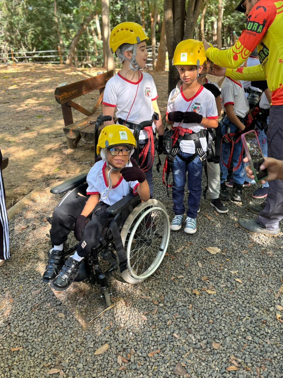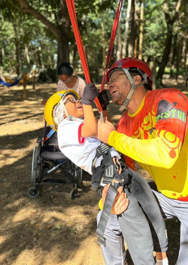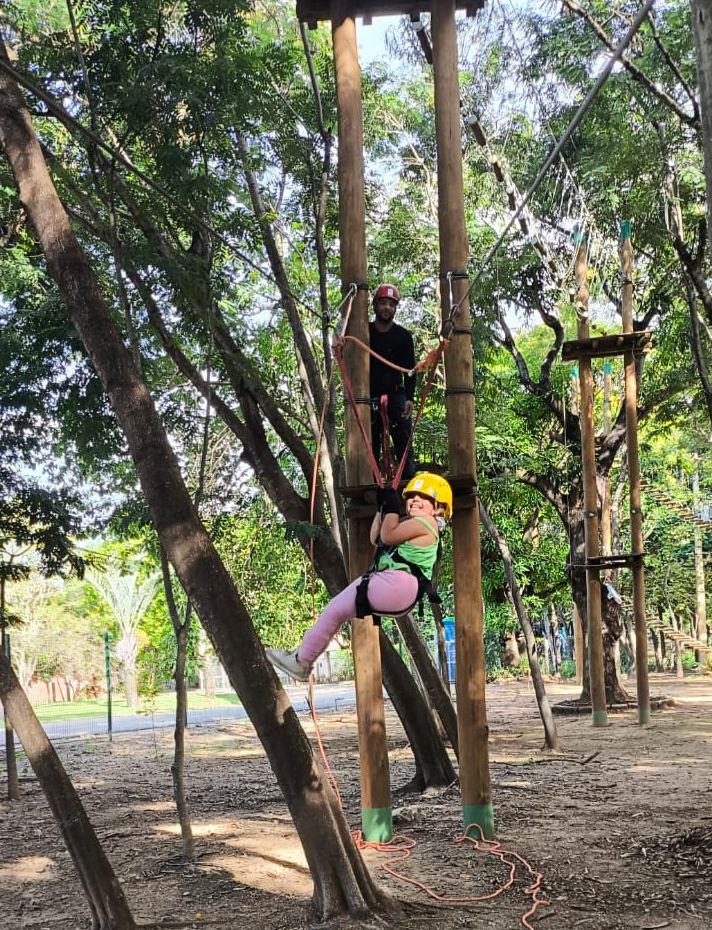 Durante as visitas, pessoas com deficiência também participam do circuito de arvorismo, uma atividade que costuma ser pouco acessível. Com o suporte da equipe e as adaptações necessárias, utilizam a tirolesa com segurança. Da mesma forma, é inspirador ver idosos se desafiando e participando da atividade, reforçando que não há um único perfil para viver essa experiencia.