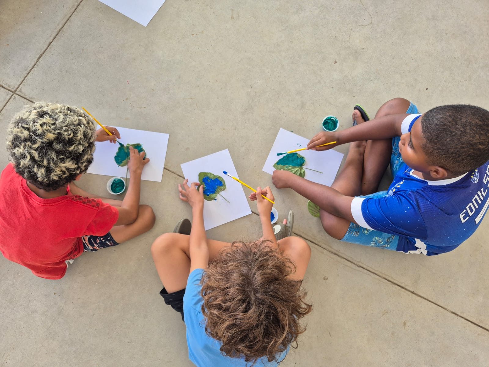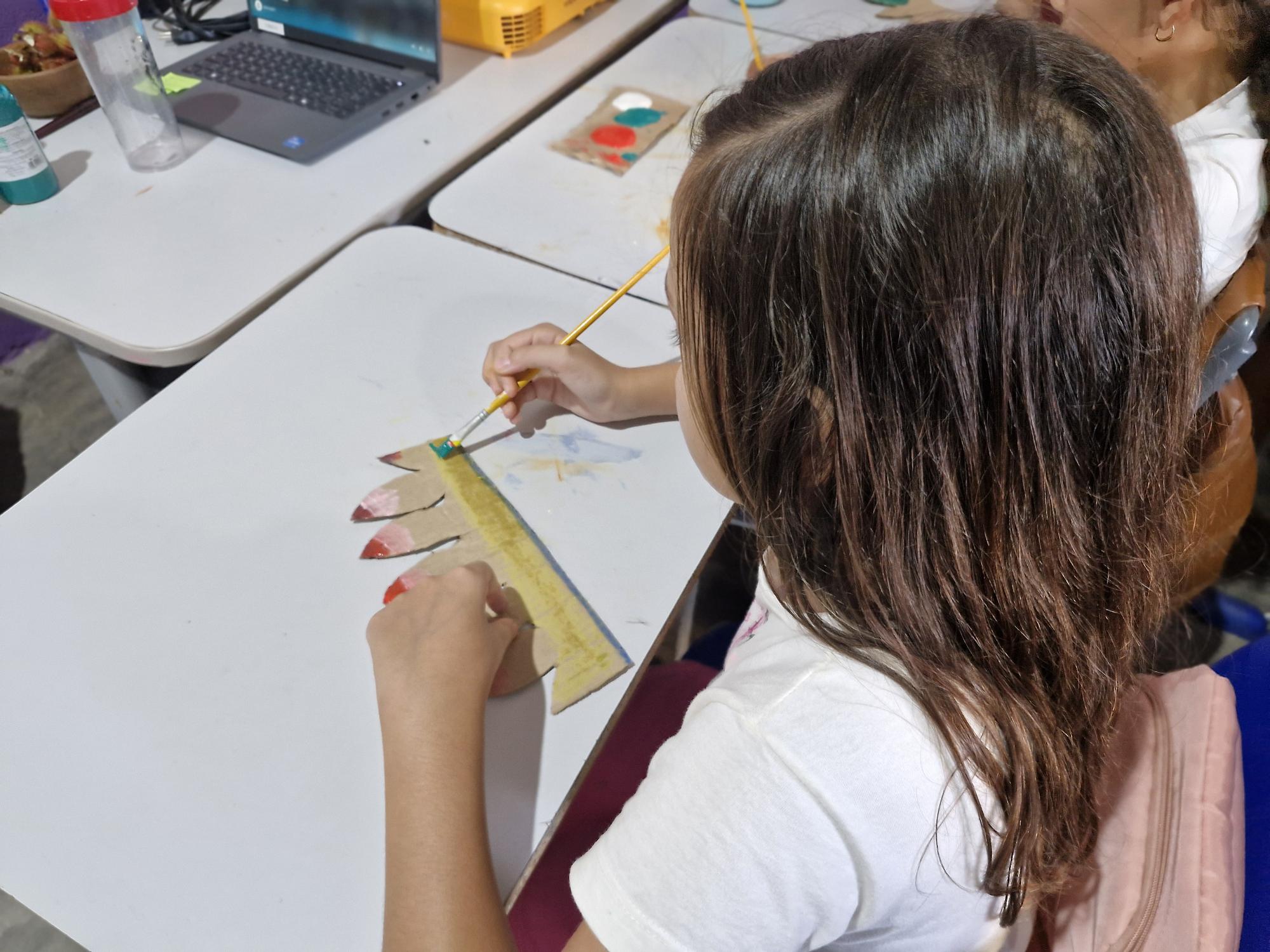 Durante o encontro, foi promovida uma roda de conversa com os alunos, abordando curiosidades sobre os povos indígenas, seus costumes e a diversidade cultural, histórica e social presente nessas comunidades. Para tornar o conteúdo mais didático e interativo, foi apresentada a contextualização sobre a produção de tintas naturais a partir de elementos da natureza, seguida de uma atividade prática de pintura com folhas.